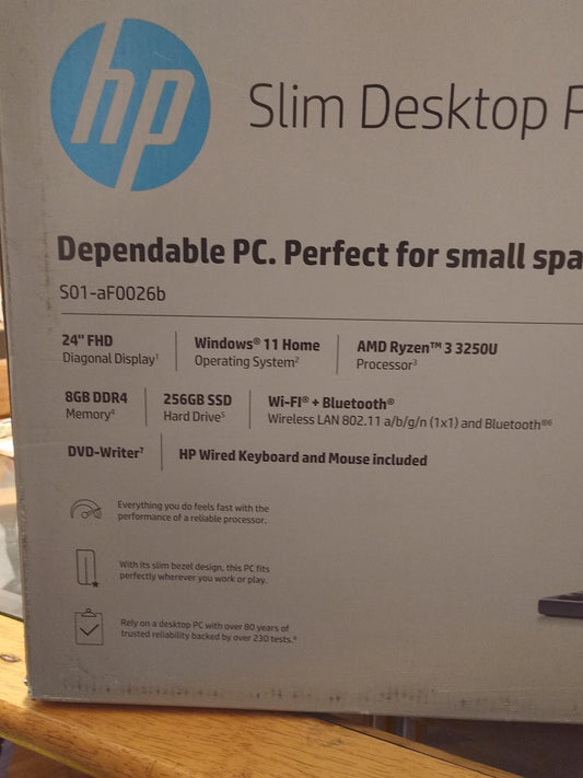 HP Slim S01-aF0026b Desktop PC Bundle, Windows 11, AMD Ryzen 3, 256GB SSD, 500GB HD, 23.8 HP Monitor, Open-Box(New)